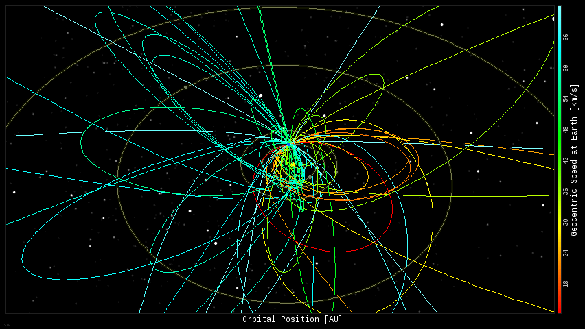 En este diagrama del sistema solar interior, todas las órbitas bola de fuego se cruzan en un solo punto - Tierra. Las órbitas son un código de colores por la velocidad, de lento (rojo) a rápido (azul). [ Imagen ampliada ] [ películas ]