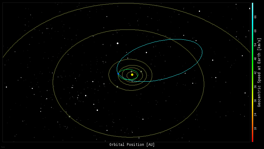 En este diagrama del sistema solar interno, todas las órbitas de la bola de fuego se cruzan en un solo punto: la Tierra. Las órbitas están codificadas por color por velocidad, desde lento (rojo) a rápido (azul). [ Imagen más grande ] [ películas ]